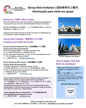 Group visits to Hawaii Betsuin and Hilo Betsuin — or 29 other Honpa Hongwanji Mission of Hawaii (HHMH) temples across Kauai, Oahu, Maui, and Hawaii Islands — are available. Please see Temple Visits for more information.